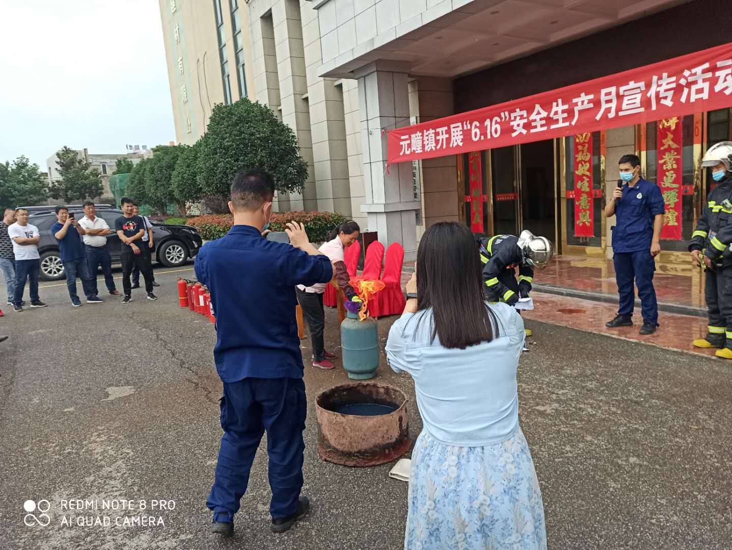 我公司员工陈才君,在消防警员的指导下,针对燃烧中的煤气瓶采取紧急救护措施,右边我公司员工陈银红在观摩。