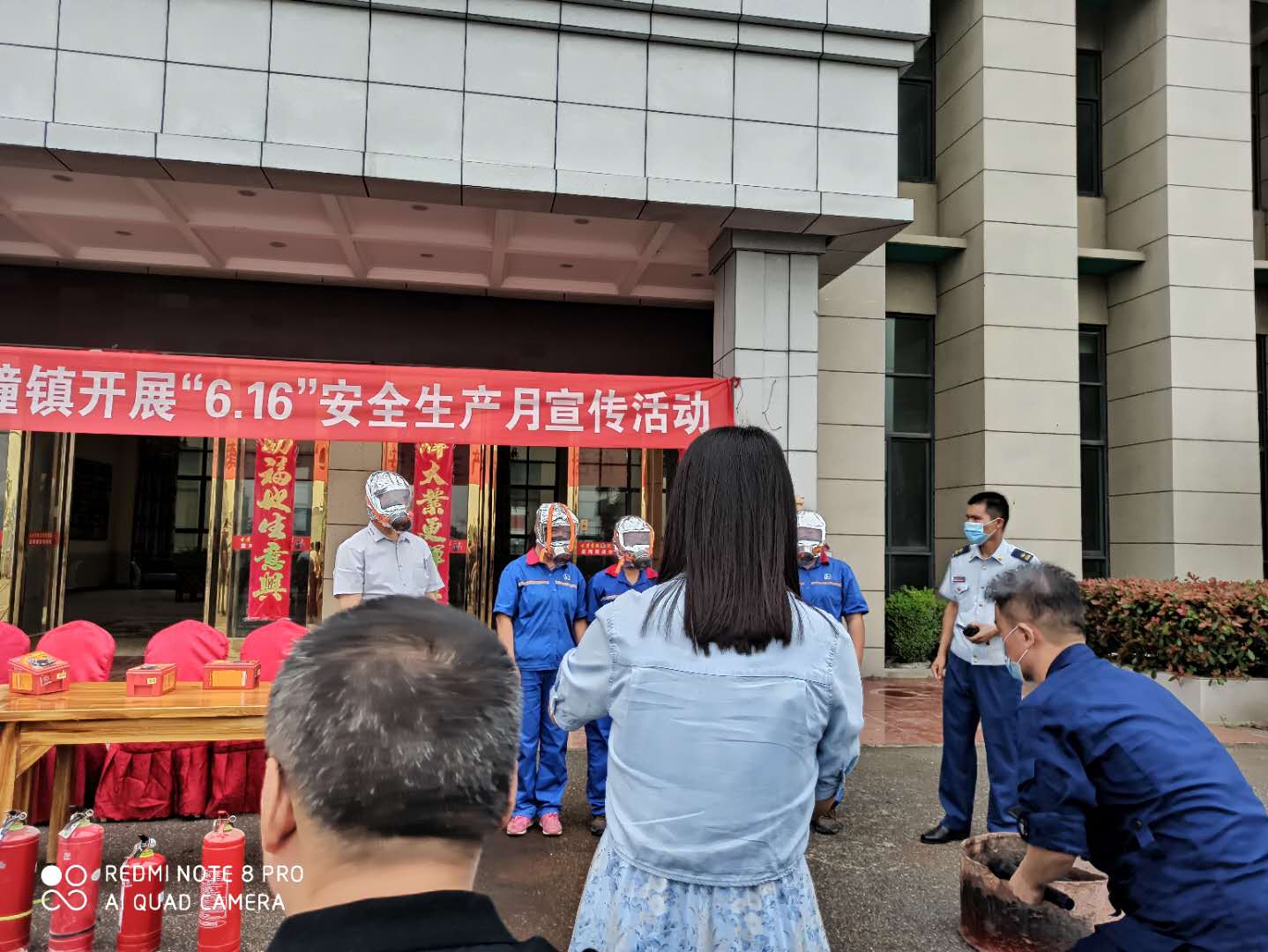 带防烟面罩逃生演练。